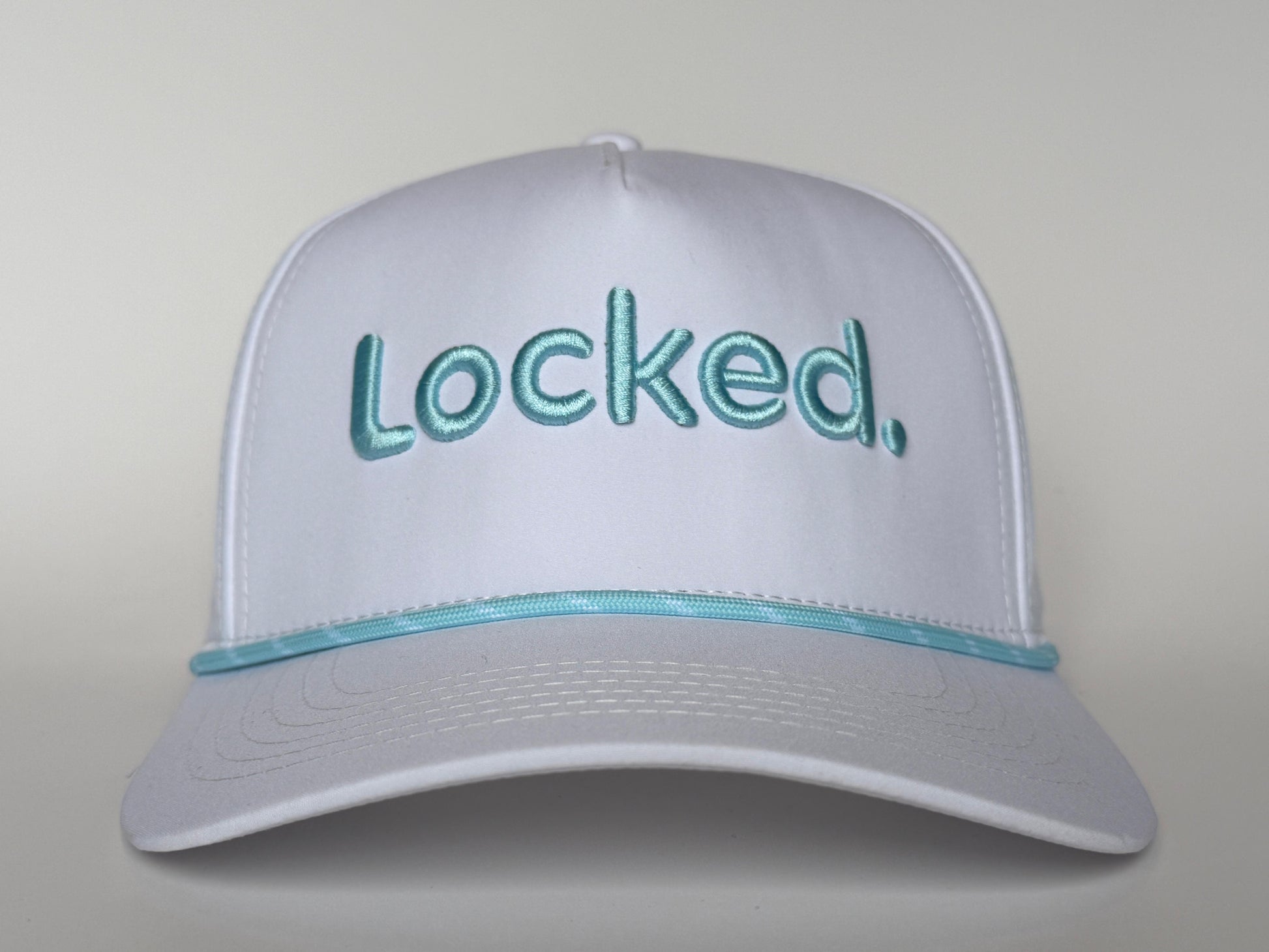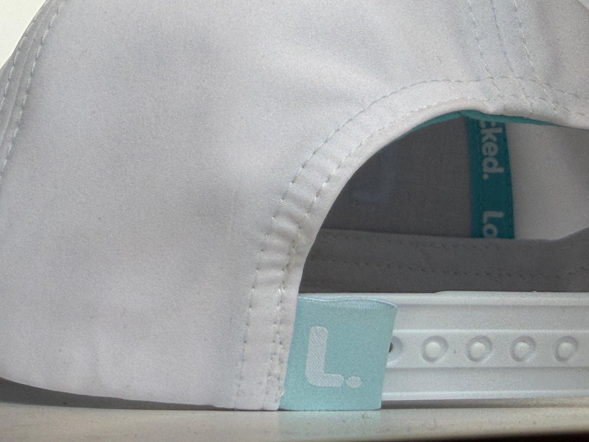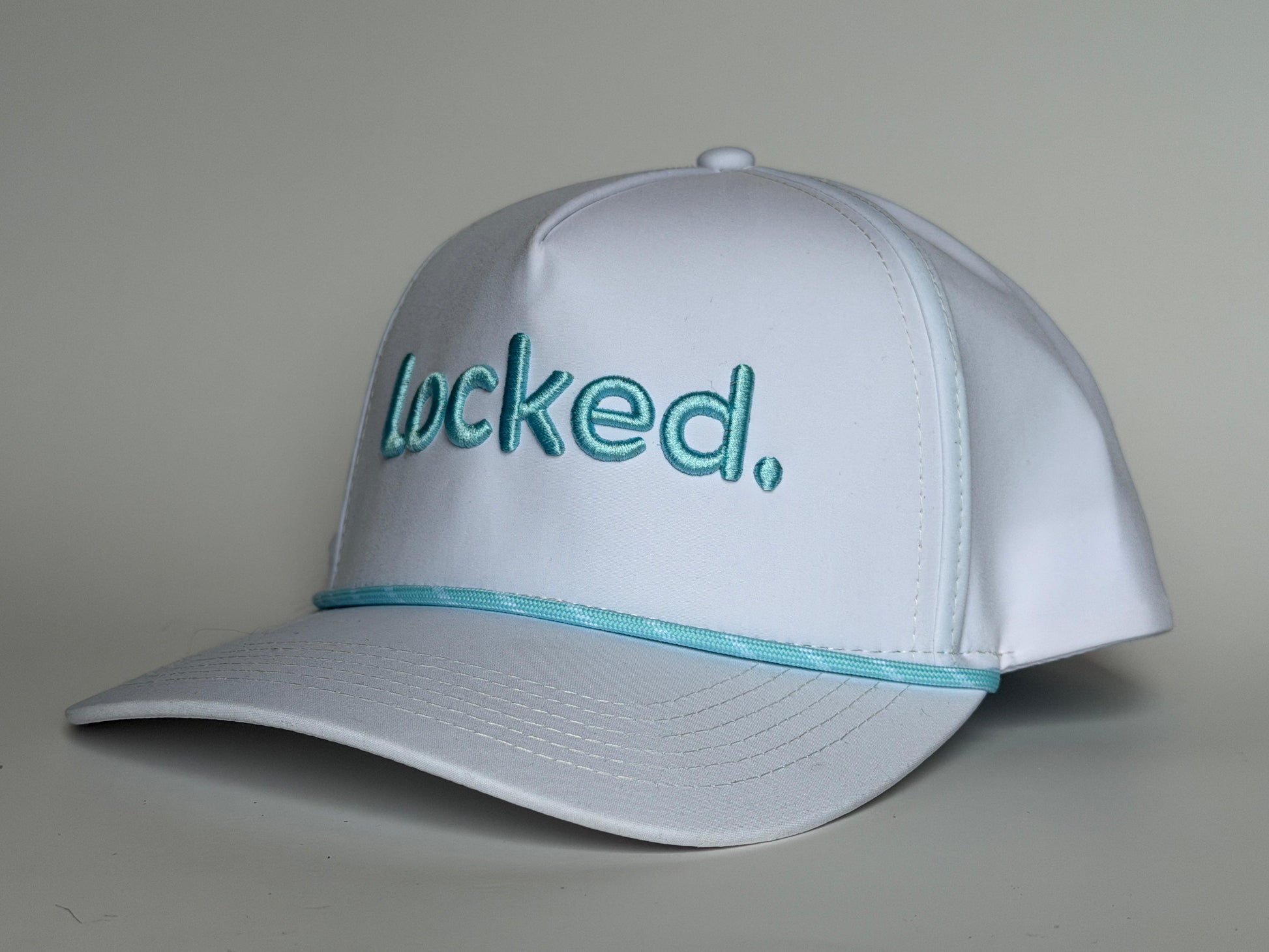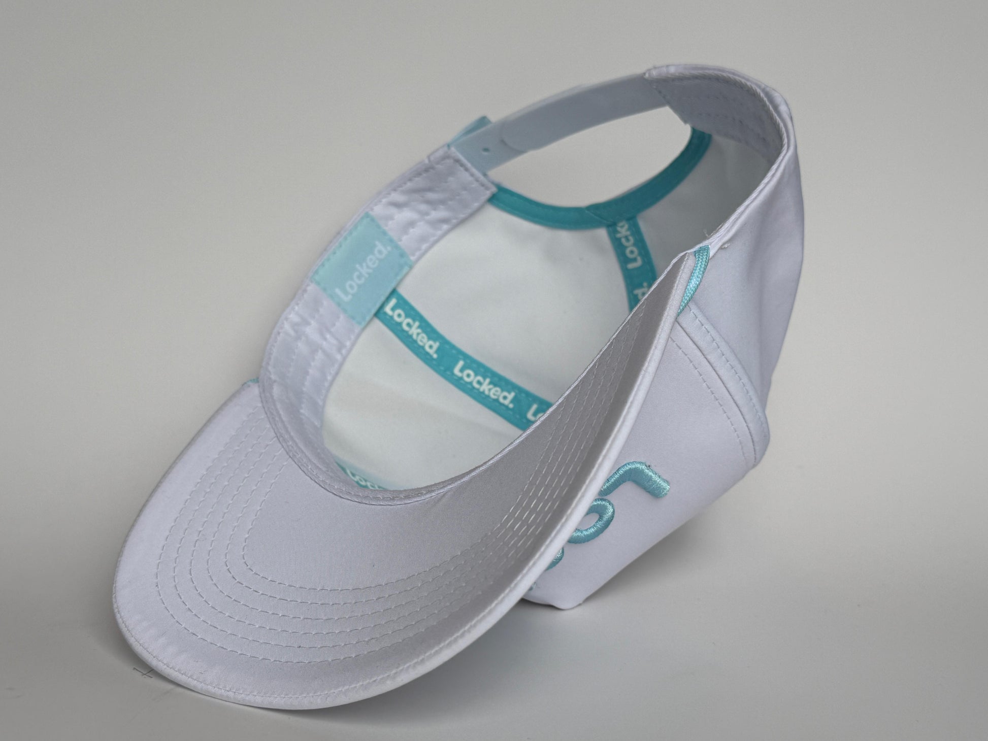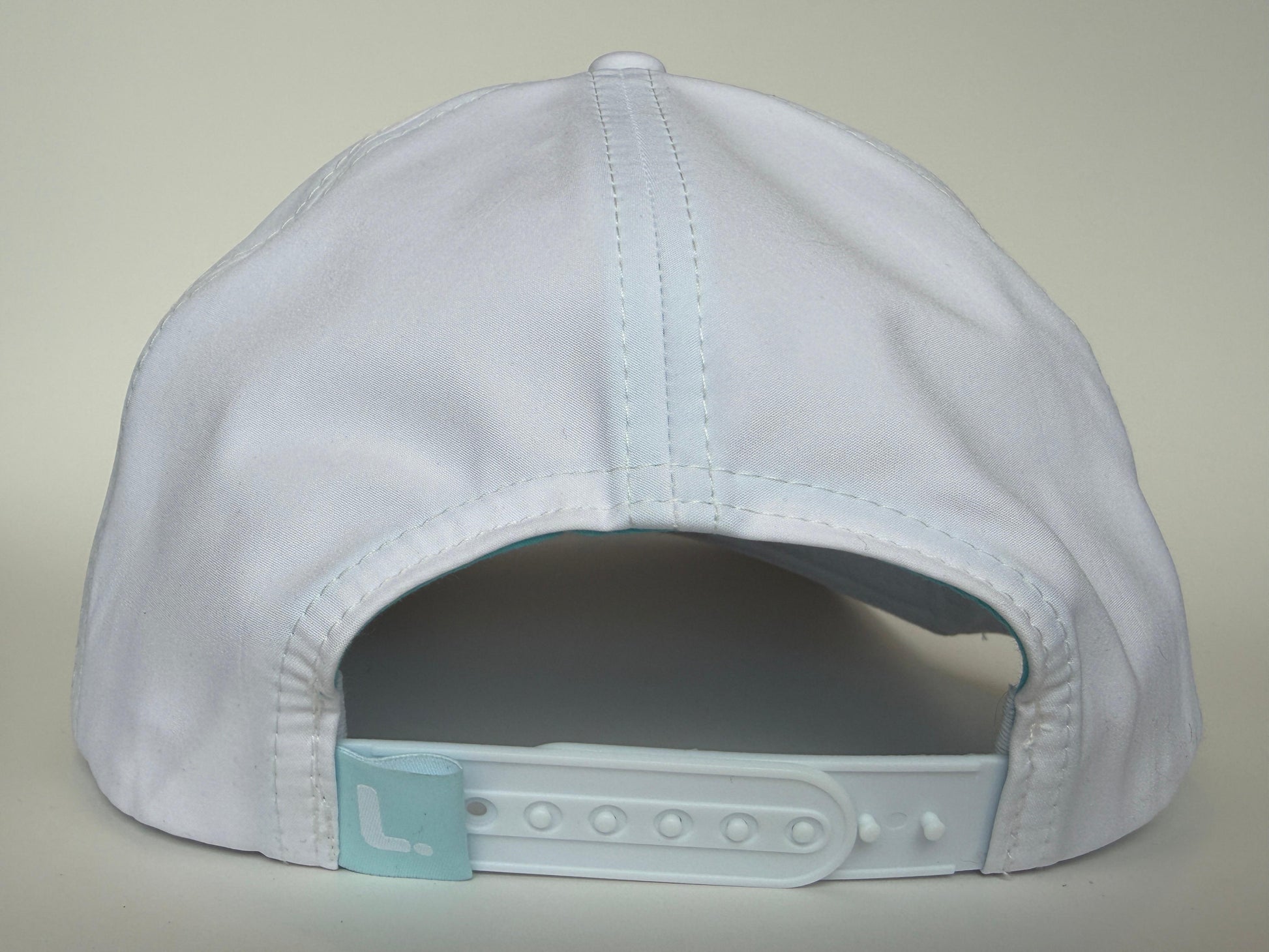 An all-white performance cap with baby-blue embroidery and a classic rope detail, designed for a clean, effortless look on and off the course.