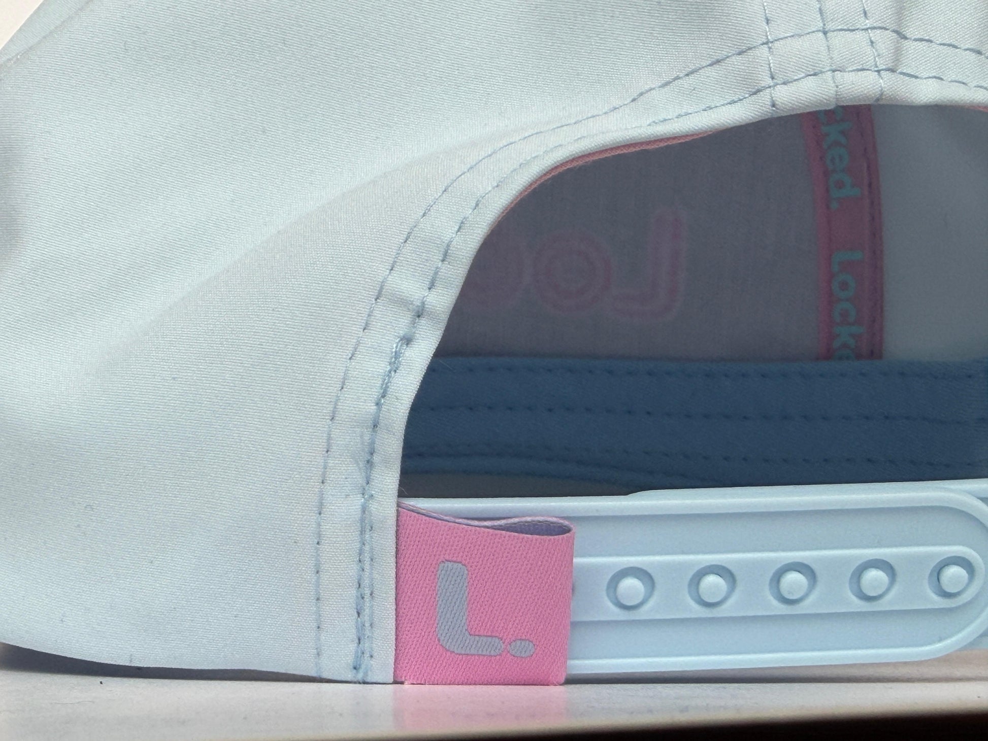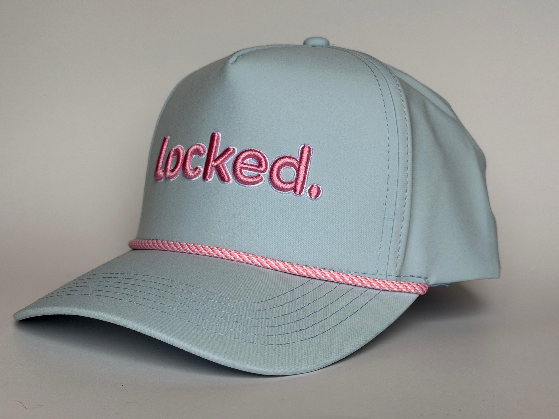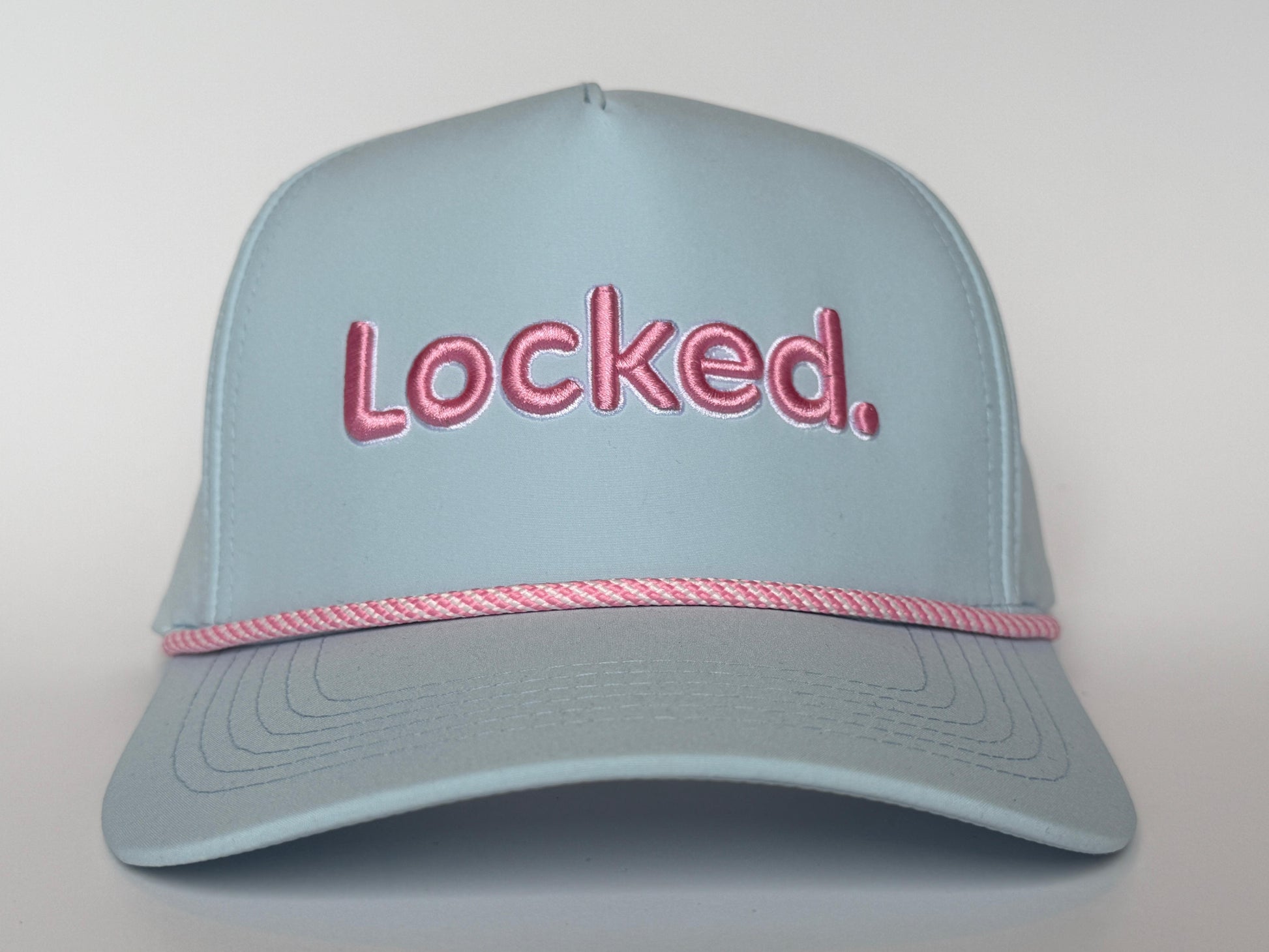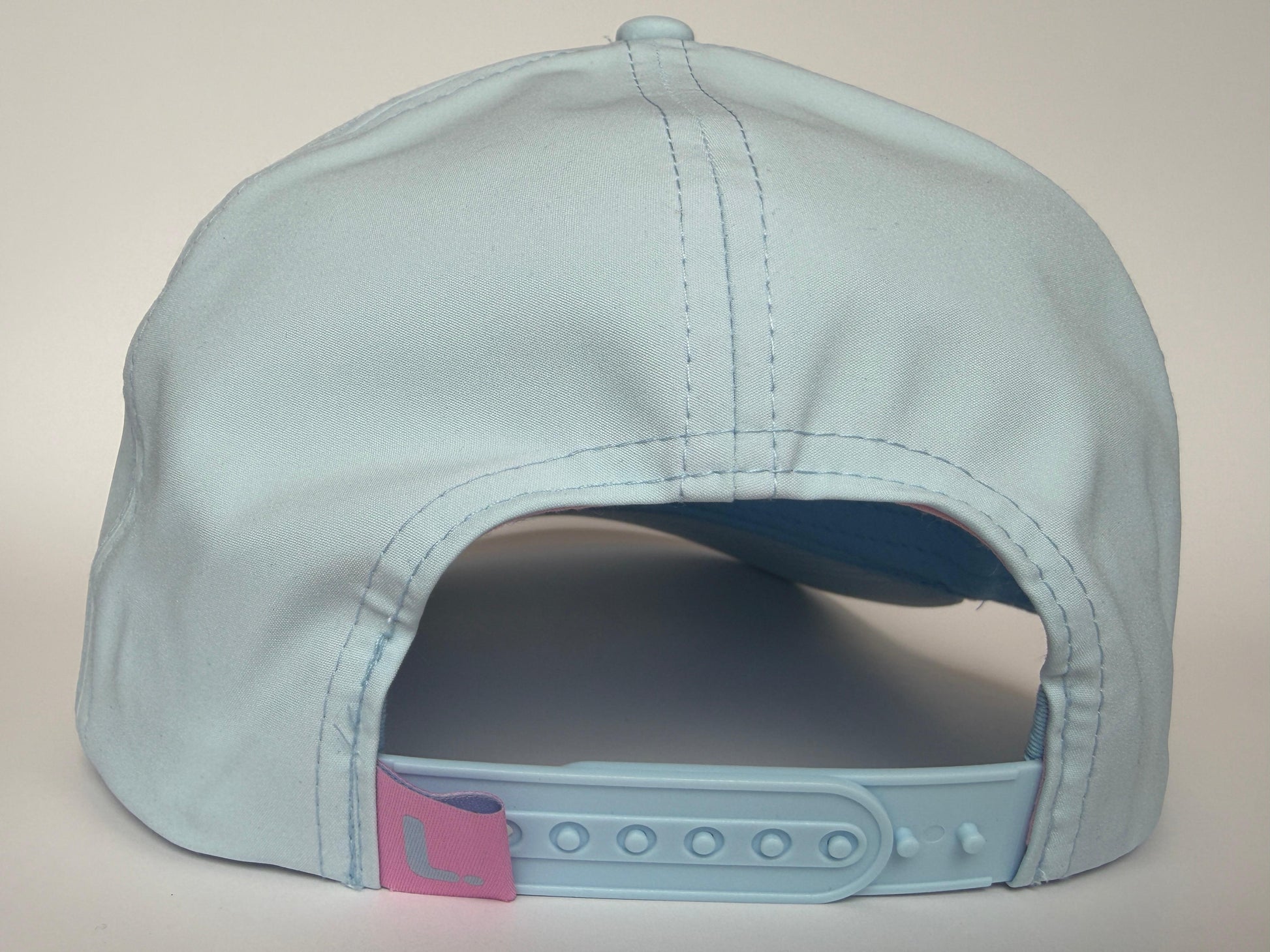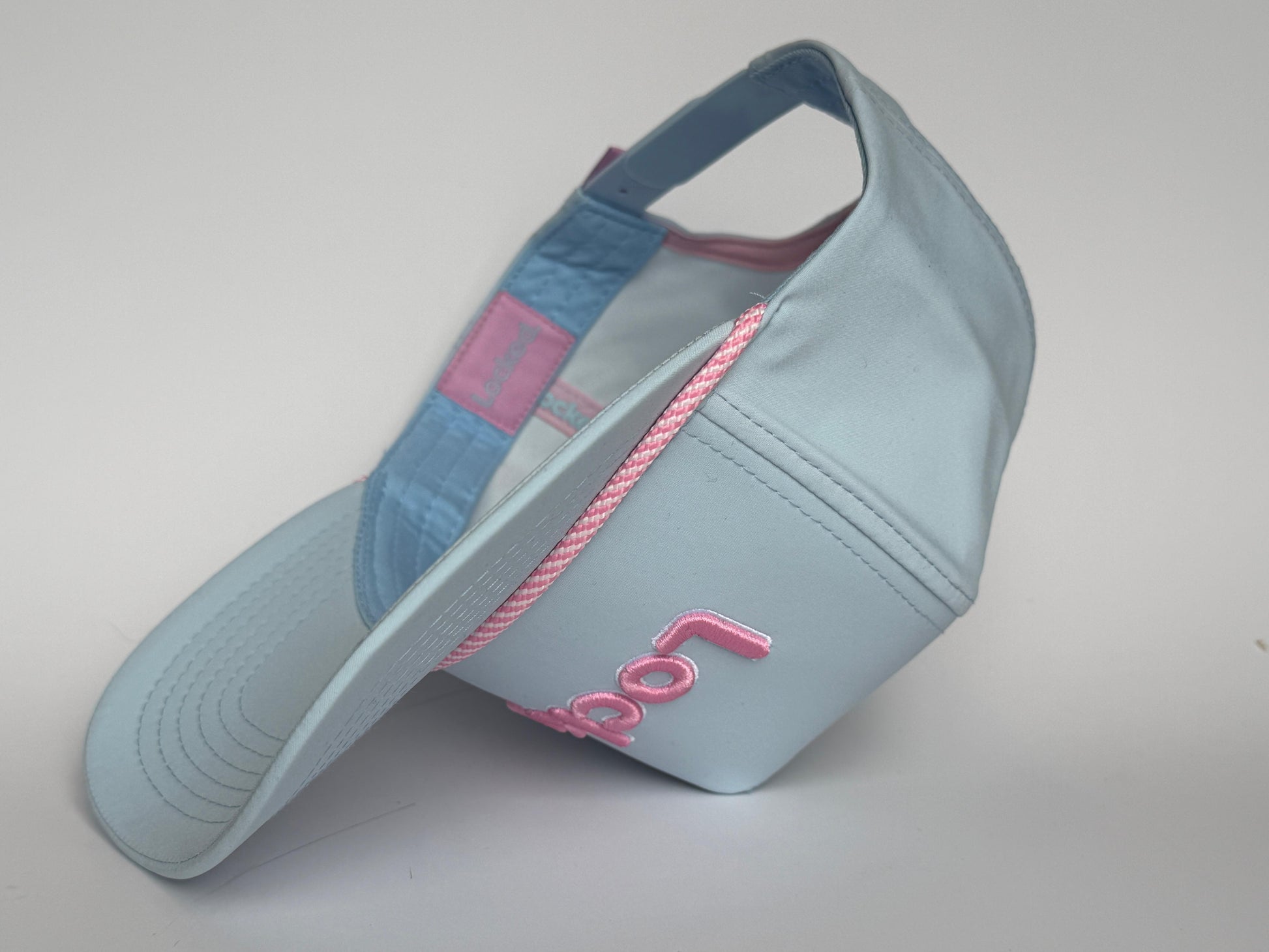 A soft blue performance cap finished with rose embroidery and a matching rope for a clean, modern look on and off the course.